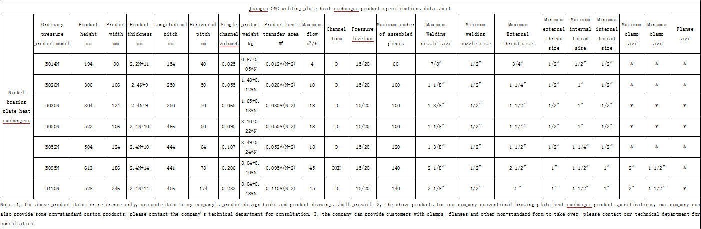 Jiangsu OMG nickel brazing plate heat exchanger product specifications data sheet
