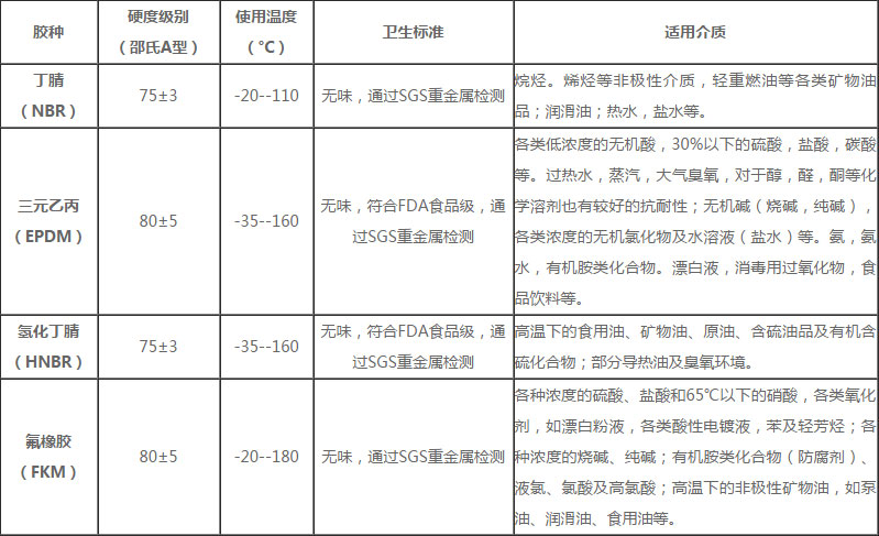 80±5 | -35--160 | 無味,符合FDA食品級,通過SGS重金屬檢測 | 各類低濃度的無機酸,30%以下的硫酸,鹽酸,碳酸等。過熱水,蒸汽,大氣臭氧,對于醇,醛,酮等化學溶劑也有較好的抗耐性;無機堿(燒堿,純堿),各類濃度的無機氯化物及水溶液(鹽水)等。氨,氨水,有機胺類化合物。漂白液,消毒用過氧化物,食品飲料等。 |